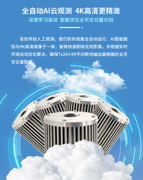 在氣象監測、光伏電站運維、航空安全保障等領域,雲量、雲狀的精準識別是核心工作之一。傳統人工觀測依賴觀測員經驗判斷,不僅耗時費力,還易受光照、天氣、主觀因素影響,誤差率居高不下。91香蕉视频APP下载自動化針對性推出DC-TC係列全天空成像儀,搭載自主研發的AI雲識別算法,將雲識別誤差率大幅降低至傳統人工觀測的30%以下,重新定義了全天空觀測的精準度與效率標準。